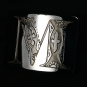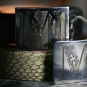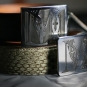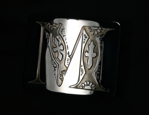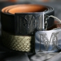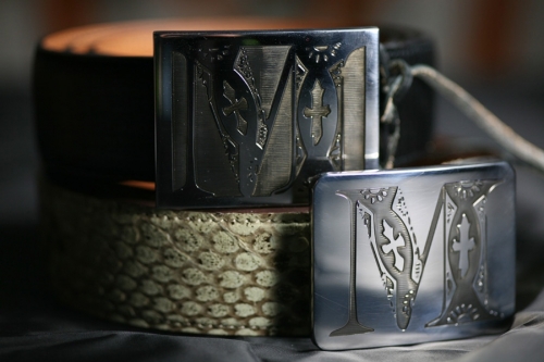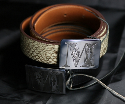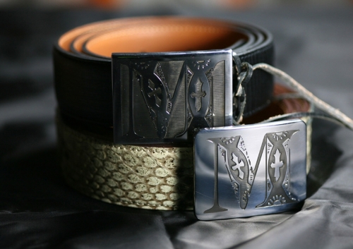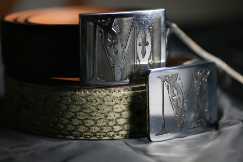 Dvě zakázkové přezky s iniciály klienta, dvě trochy trápení s aplikací průhledného černého smaltu (i při mých nestandardních standardech značně nestandardní řešení :-). Kompletováno s černým palmelatem a pythonem.