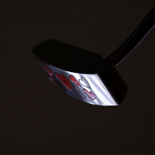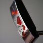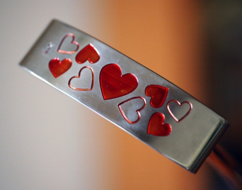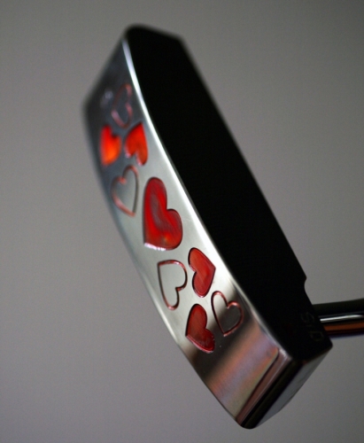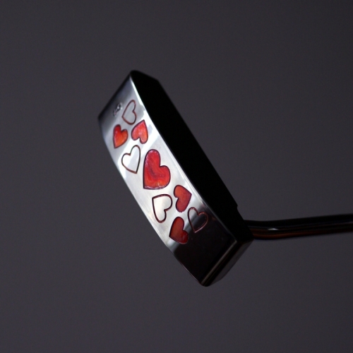 SiD s custom gravírováním, 34", červený kožený grip. Na vybarvení srdcí jsem použil speciální průhlednou barvu, trochu jsem se sice natrápil s technologií, ale výsledek snad stojí za to. Patří k němu jestě bílý headcover s monogramem.