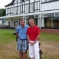 Elektricky ovládanou branou vjíždíme na skoro prázdné parkoviště klubu (jsme tu brzo). U klubovny nás vítá Senior Captain (to, že to je on se dozvídám později) a místo pozdravu sděluje kód (fivezerofourzero), jak se přes klávesnici u vchodu do klubovny dostaneme. Kde je tu recepce? Co? Recepce! Nevím, zeptejte se v shopu. Cesta do shopu vede naštěstí okolo trucku anglické golfové federace, kde je registrace hráčů. Našli jsme, co jsme hledali. Komisař uvnitř je evidentně potěšen Markovým cizím přízvukem a připadá si důležitě. Kde je tu driving? Co? Driving! Někde, kde je možné trénovat. Aha. Jeďte 400 yardů tímhle směrem a tam to uvidíte. Ok. Automat na balony je tam? Co? Automat na balony. Aha. Vezměte si svoje. Pokud nemáte, je tu shop, tam si je můžete koupit. Aha. Místo jízdy na louku jdeme omrknout klubovnu, 2 klece se sítí za shopem (driving) a to co je vidět ze hřiště (jednička, pětka a osmnáctka). Ferveje jsou značně hnědé, rafy ještě hnědší, ale to může být samozřejmě optický klam.